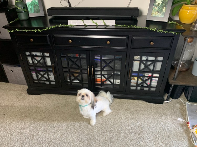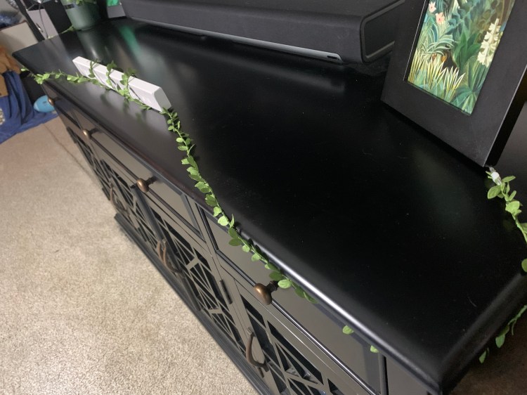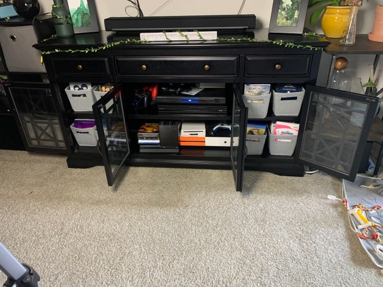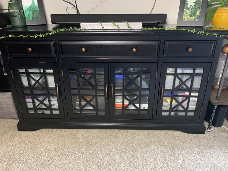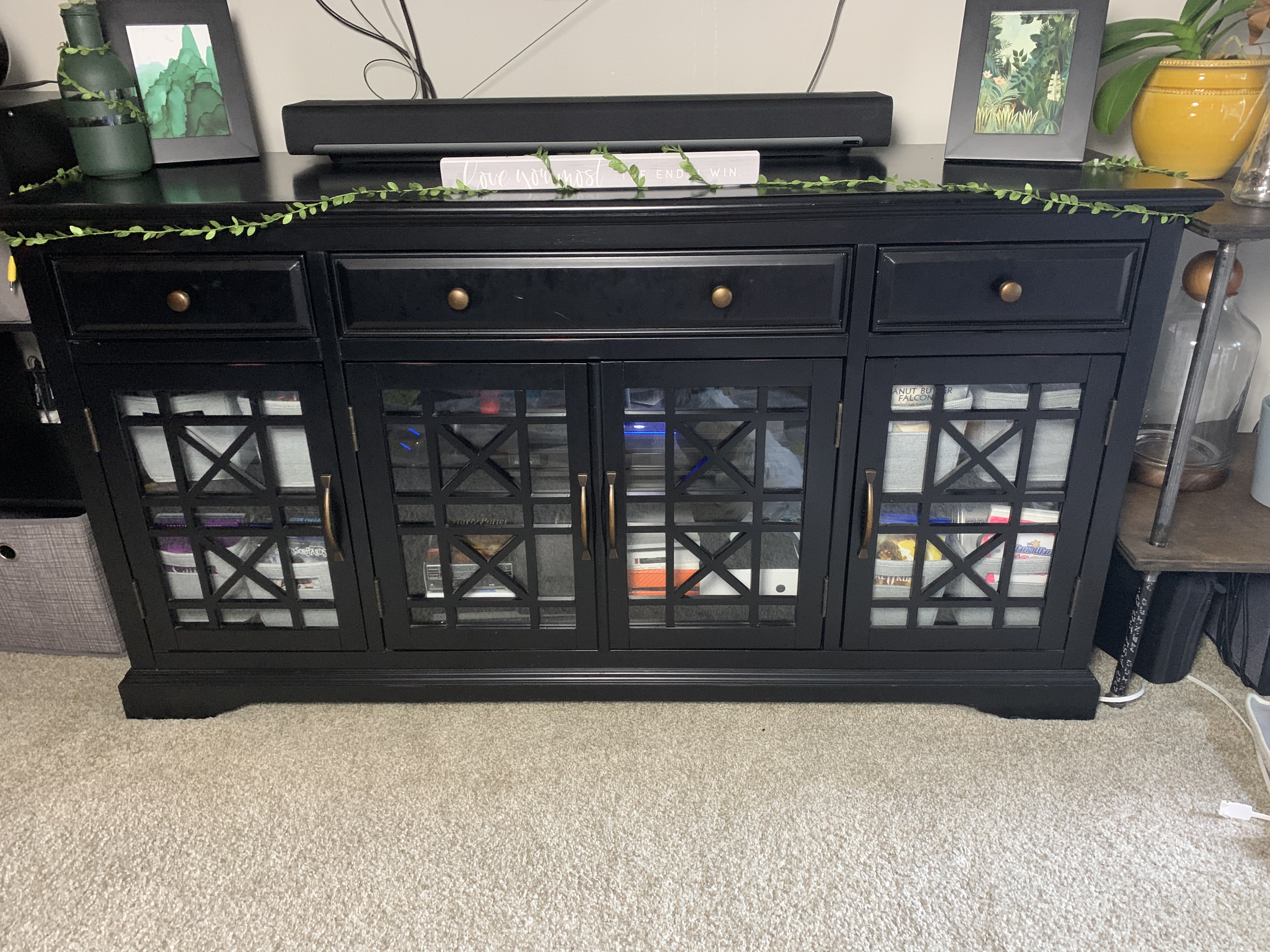 Description: Find a new way of organizing with this beautiful media console. In a satin black, it is a great choice to match any TV. It can be used as a stand or to frame your entertainment area how ever you’d like. With 3 low profile drawers, you can store just about anything for your needs. Below you can see the spacing has a ton of room for all your electronics. The side areas have enough room to store up to 120 Blu-ray sized cases for those into movies or music.