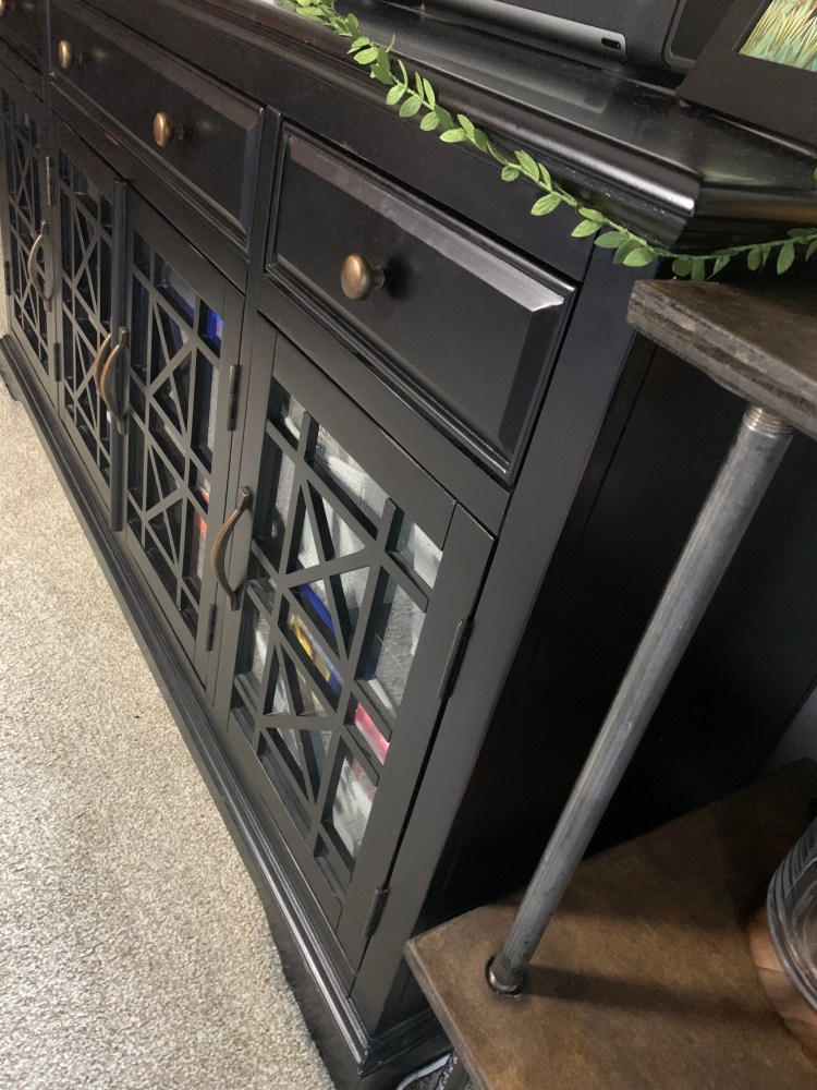 The storage underneath is protected by glass doors to make sure visibility is guaranteed. With accentuating handles that are brushed brass styling, this media console is truly a statement itself.