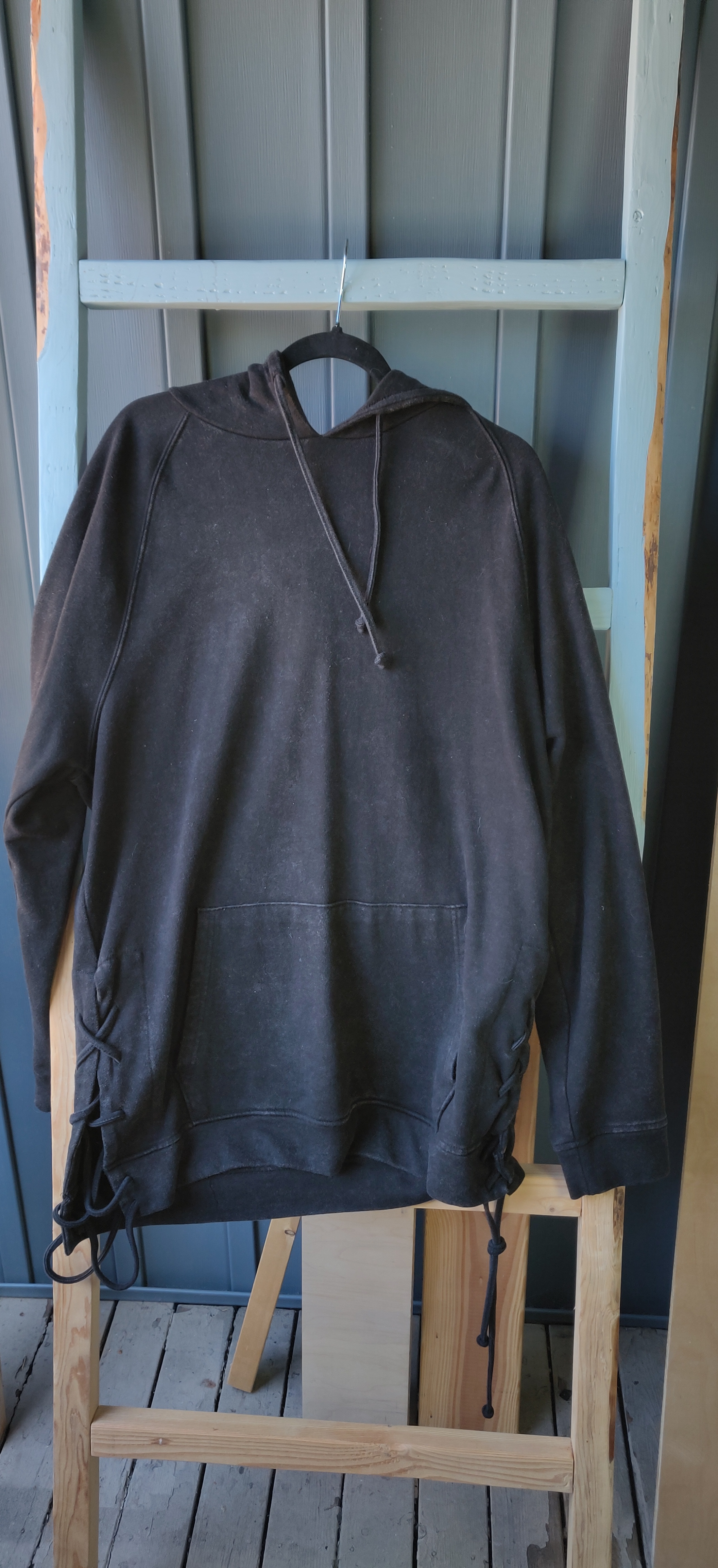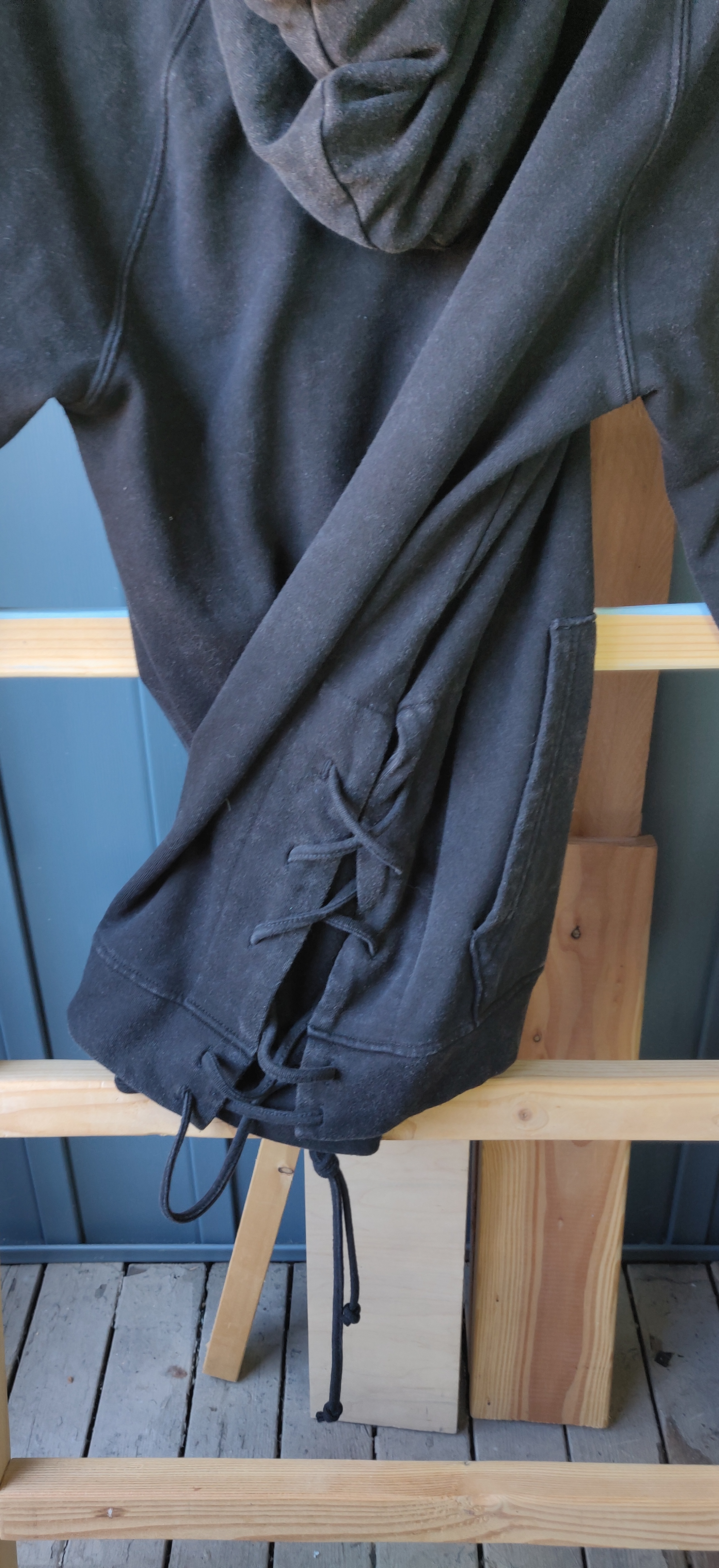 With a longer style torso section, this has more of a draped look. The faded color design is stylish and simple. The sides have been adorned with ties to make the wearer more or less loose to their liking. The hoodie is also very large for those who enjoy the idea of a deep hood