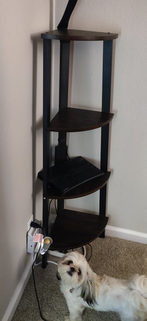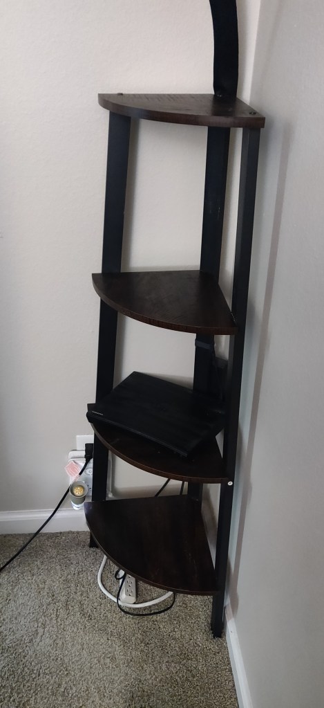 Description: Need a storage solution for your corner? This great looking shelf might be the thing for you! This three tiered shelf is perfect for a small space. It adds much needed storage space without taking up too much room. The additions keep coming as the rear of the shelf also has a few ties for cable management to keep any entertainment wires in check!
